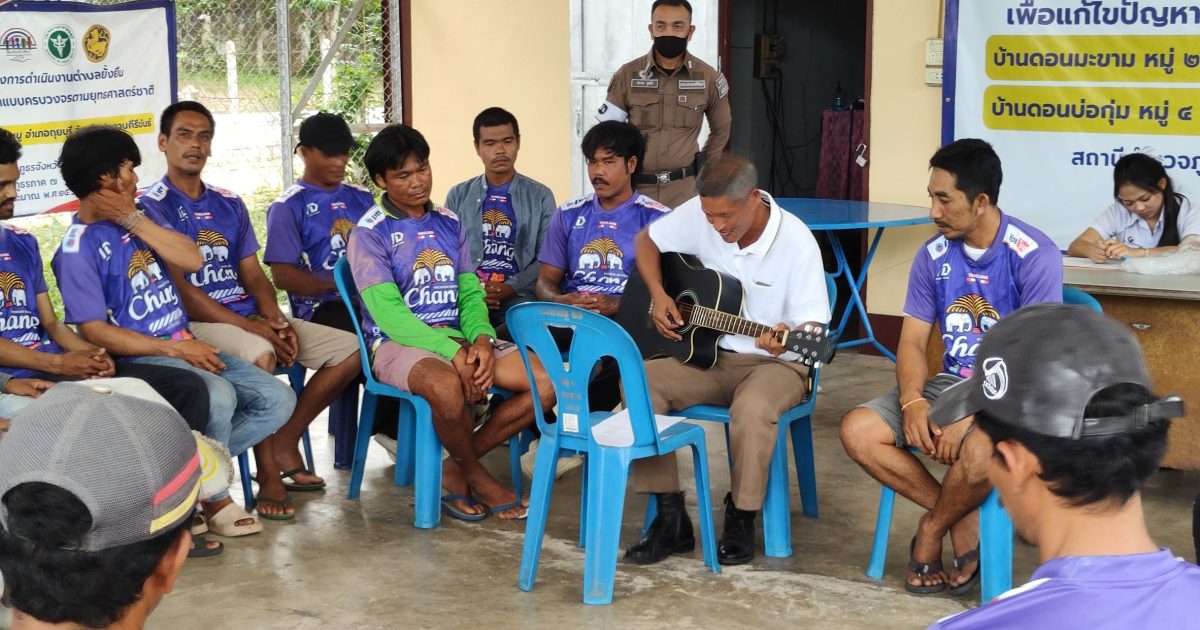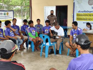 พร้อมด้วย จนท.ตร.ชุด ชป.ตำบลยั่งยืน สภ.กุยบุรี,เจ้าหน้าที่สาธารณสุข รพ.สต.บ้านดอนยายหนู ,ผู้ใหญ่บ้านดอนบ่อกุ่ม,ผู้ใหญ่บ้านดอนมะขาม ร่วมกันทำกิจกรรมบำบัด โดย ร.ต.ต.ธีรวุธ จอมชิตกล่ำ รอง สว.(ป.) สภ.กุยบุรี ได้แสดงการเล่นดนตรี กีตาร์ ให้กับผู้บำบัดที่เข้าร่วมกิจกรรมโดยพร้อมเพรียงกัน ณ.ศาลาเอนกประสงค์หมู่บ้านดอนบ่อกุ่ม ม.4 ต.ดอนยายหนู อ.กุยบุรี จ.ประจวบฯ