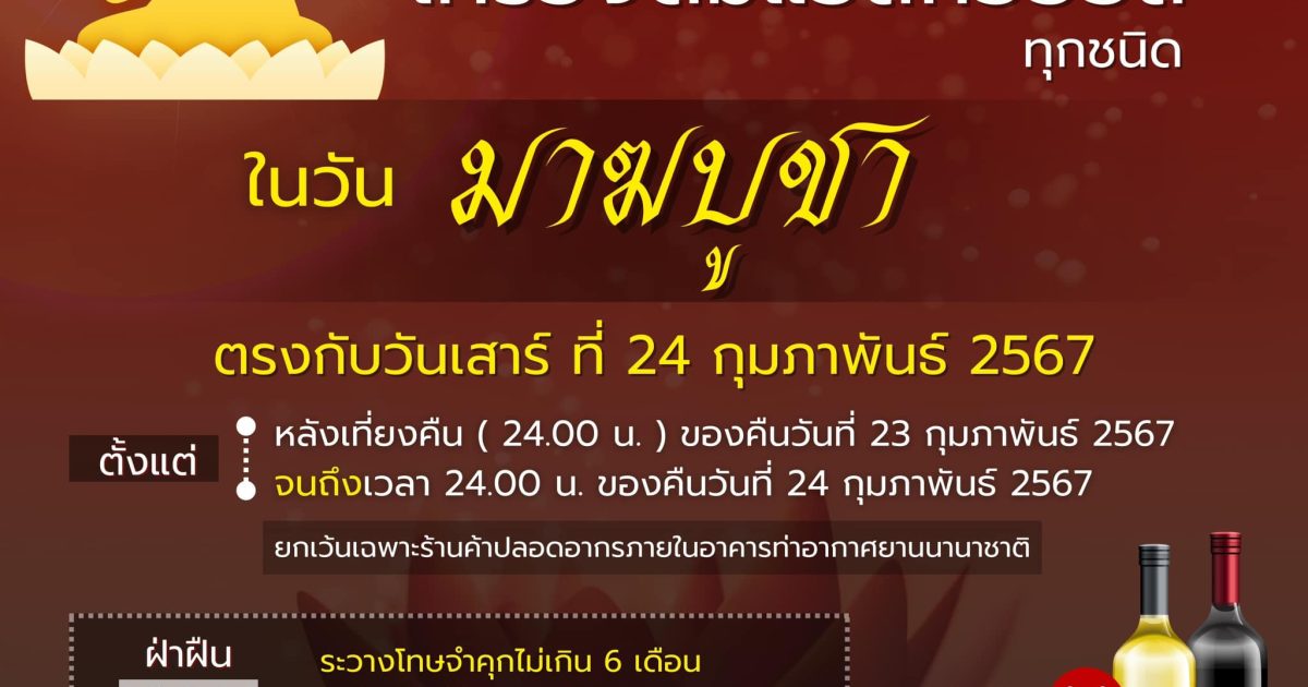 ประชาสัมพันธ์์… งดจำหน่ายเครื่องดื่มแอลกอฮอล์ เนื่องในวันมาฆบูชา ประจำปี 2567 ทุกช่องทาง “ผบ.ตร.” กำชับดูแลความปลอดภัย พร้อมอำนวยความสะดวกการจราจรสถานที่สำคัญทางพุทธศาสนา และสถานที่ท่องเที่ยว