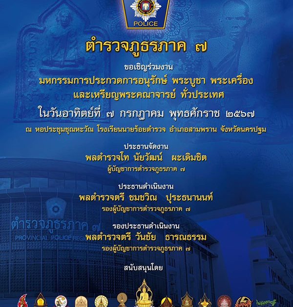 ตำรวจภูธรภาค 7 โดย พล.ต.ท.นัยวัฒน์ ผะเดิมชิต ผบช.ภ.7 /ประธานจัดงาน พล.ต.ต.ชมชวิณ ปุระธนานนท์ รอง ผบช.ภ.7/ประธานดำเนินงาน พล.ต.ต.วันชัย ธารณธรรม รอง ผบช.ภ.7/รองประธานดำเนินงาน