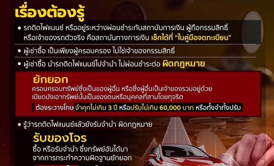 สำนักงานตำรวจแห่งชาติ จึงขอเตือนพี่น้องประชาชนว่า รถที่ติดไฟแนนซ์หรืออยู่ระหว่างผ่อนชำระกับสถาบันทางการเงิน ผู้ถือกรรมสิทธิ์หรือเจ้าของรถตัวจริงของรถคันดังกล่าว คือสถาบันทางการเงิน ส่วนผู้เช่าซื้อเป็นเพียงผู้ครอบครองเท่านั้น ไม่ได้เป็นเจ้าของกรรมสิทธิ์โดยสมบูรณ์
