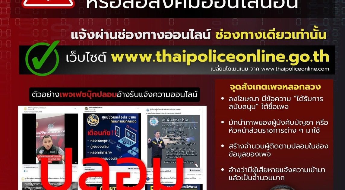 เมื่อวันที่ 31 ธันวาคม 2566 พล.ต.ต.ศิริวัฒน์ ดีพอ รองโฆษกสำนักงานตำรวจแห่งชาติ กล่าวว่า พล.ต.อ.ต่อศักดิ์ สุขวิมล ผบ.ตร. ได้มีความห่วงใยพี่น้องประชาชนที่อาจได้รับความเสียหายจากอาชญากรรมรูปแบบต่าง ๆ ซึ่งในปัจจุบันได้มีกลุ่มมิจฉาชีพที่อาศัยการสร้างเพจเฟซบุ๊กปลอมพร้อมมีการลงโฆษณา อ้างเป็น สำนักงานตำรวจแห่งชาติ หรือหน่วยงานราชการอื่น ระบุข้อความว่าสามารถแจ้งความออนไลน์ได้ที่บัญชีสื่อสังคมออนไลน์ดังกล่าว ซึ่งไม่เป็นความจริง และมีการหลอกลวงเอาทรัพย์สินโดยการอ้างว่าเป็นค่าดำเนินการ ค่าเร่งรัดคดีเป็นกรณีพิเศษ หรือเป็นวิธีการที่จะทำให้ได้เงินคืนจากคนร้าย โดยหลอกให้เข้าลงทุนในเว็บไซต์หลอกลงทุนหรือหลอกให้เข้าเล่นเว็บไซต์พนันออนไลน์ ทำให้มีพี่น้องประชาชนหลงเชื่อได้รับความเสียหายเป็นจำนวนมาก
