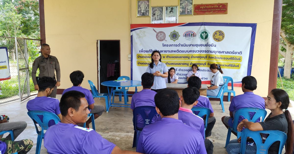 พ.ต.อ.วรวัชร แค้มวงค์ ผกก.สภ.กุยบุรี , พ.ต.ท.เสน่ห์ สำเนียงสูง รอง ผกก.ป.สภ.กุยบุรี,นายอำไพ หุ่นงาม ประธาน กต.ตร.สภ.กุยบุรี พร้อมด้วย จนท.ตร.ชุด ชป.ตำบลยั่งยืน สภ.กุยบุรี,เจ้าหน้าที่สาธารณสุข รพ.สต.บ้านดอนยายหนู ,ผู้ใหญ่บ้านดอนบ่อกุ่ม,ผู้ใหญ่บ้านดอนมะขาม ร่วมกันทำกิจกรรมบำบัด โดยมีผู้บำบัดเข้าร่วมกิจกรรมโดยพร้อมเพรียงกัน ณ.ศาลาเอนกประสงค์หมู่บ้านดอนบ่อกุ่ม ม.4 ต.ดอนยายหนู อ.กุยบุรี จ.ประจวบฯ