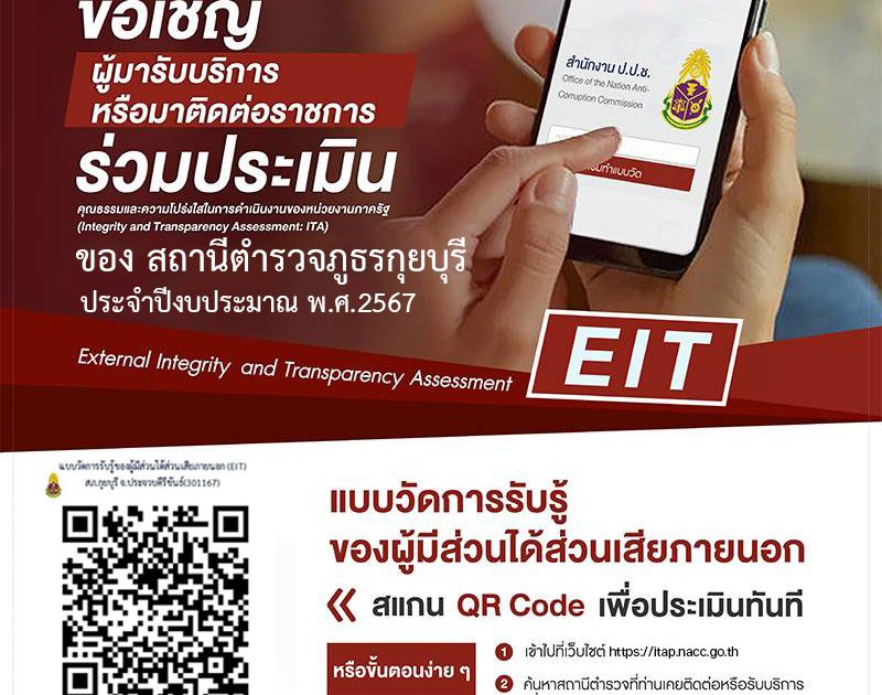 พ.ต.อ.วรวัชร แค้มวงค์ ผกก.สภ.กุยบุรี พร้อมข้าราชการตำรวจ สภ.กุยบุรีขอเชิญ ผู้มารับบริการหรือผู้มาติดต่อราชการร่วมประเมินคุณธรรมและความโปร่งใสในการดำเนินงานของหน่วยงานภาครัฐ ( Integrity and Transparency Assessment: ITA ) แบบวัดการรับรู้ ของผู้มีส่วนได้ส่วนเสียภายนอก ( แสกน QR Code เพื่อประเมินทันที หรือขั้นตอนง่าย ๆ 1 เข้าไปที่ เว็บไซต์ https://itap.nacc.go.th