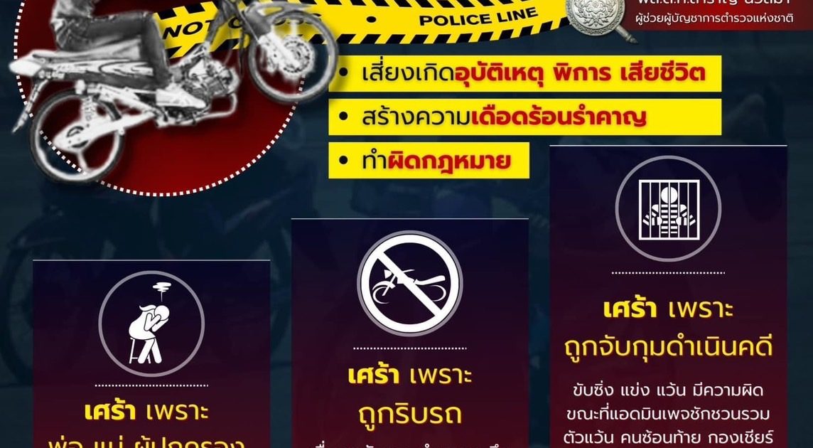 พล.ต.ท.สำราญ ฯ เผย สำนักงานตำรวจแห่งชาติปราบปรามเด็ดขาด เด็กแว้น รถซิ่ง ป่วนเมือง สร้างความเดือดร้อน สกัดเข้ม 3 ทาง สายออกทริปยกล้อต้องระวัง! พร้อมงัด 4 มาตรการ “ขับ – ซ้อน – เชียร์ – ชักชวน – ผู้ปกครอง” โดนแน่ รับโทษหนัก คุก ปรับ ริบรถ