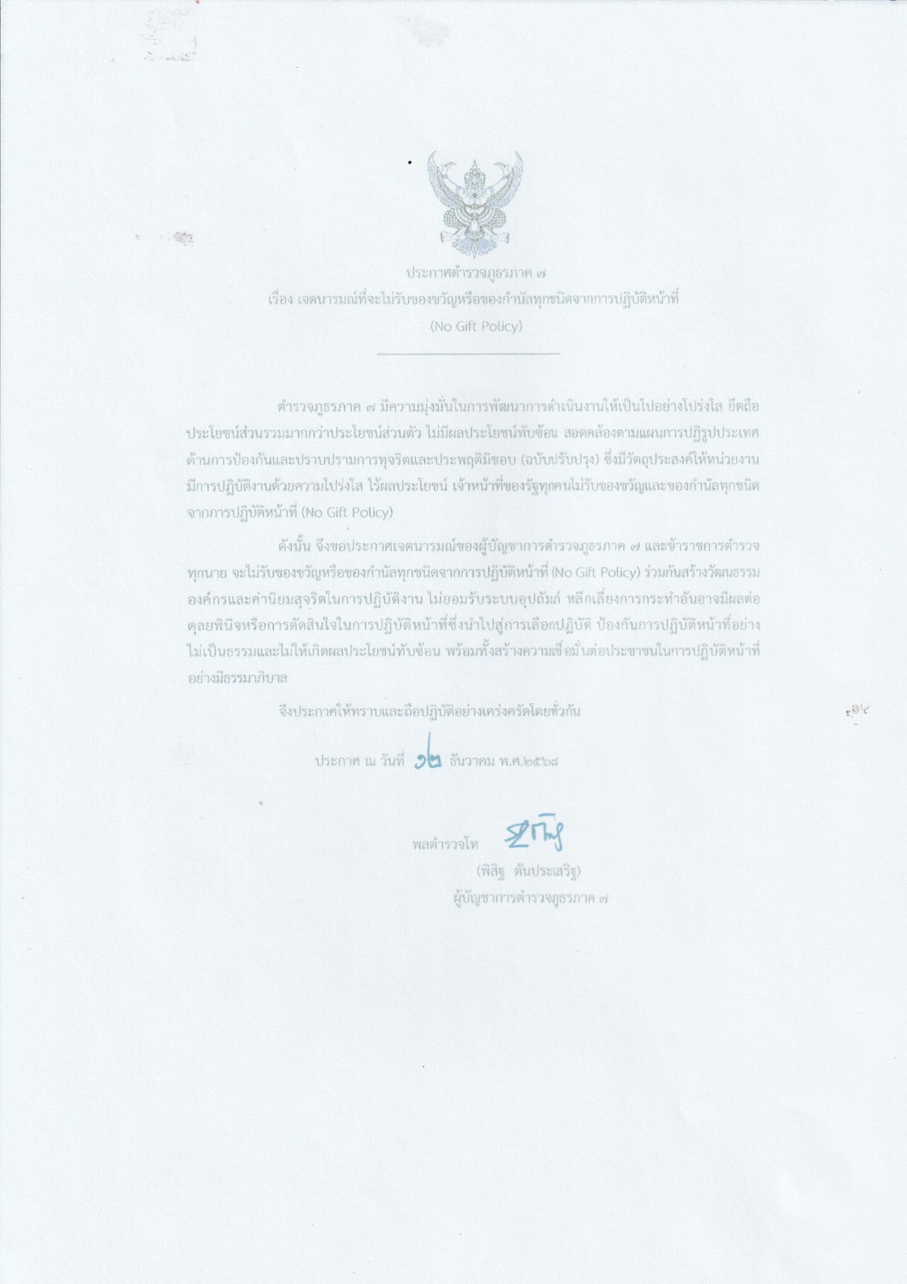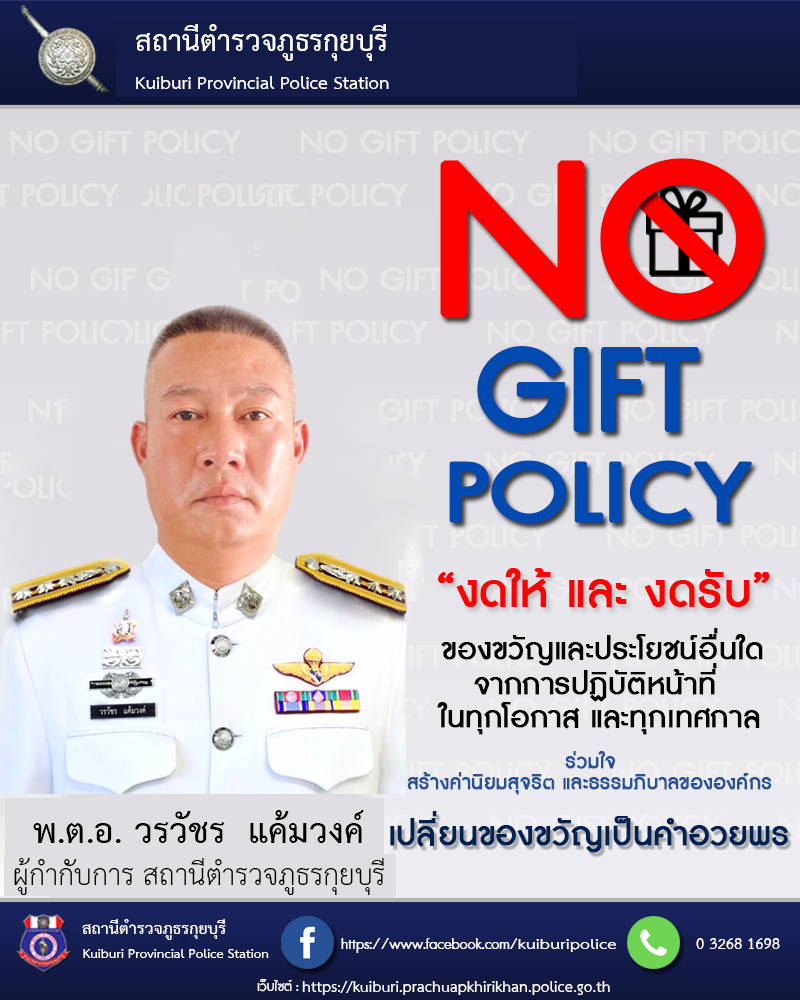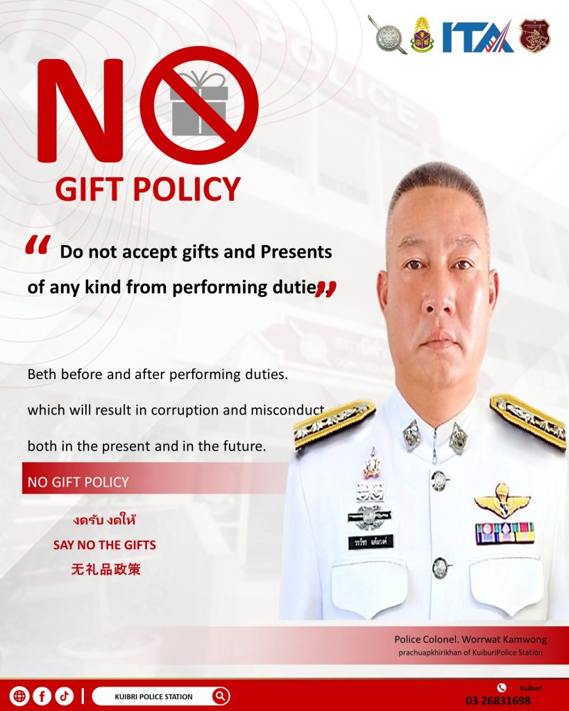 - ประกาศสำนักงานยุทธศาสตร์ตำรวจเรื่องเจตนารมณ์ที่จะไม่รับของขวัญหรือของกำนัลทุกชนิดจากการปฏิบัติหน้าที่